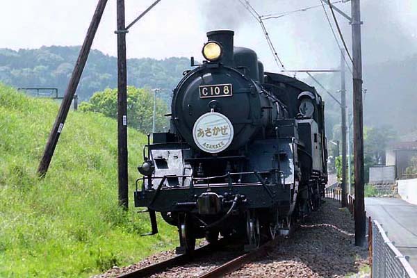 よく見ても見なくてもカマはC10じゃないの。というわけで、今回ご紹介は大井川鉄道の SLが「あさかぜ」のヘッドマークを掲示して走った時のもの。この頃は大井川鉄道にも まだ不案内で、撮影場所もわからぬままに、ただ金谷駅の近くで撮っただけ。ちなみに 土手の向こうは東海道本線。ところが今年10月のダイヤ改正でSL列車は原則新金谷 始発になるとのことで、ここを走る姿はもう見納め。そう思うと、この下り勾配の線路脇 での何の変哲も無い写真が、急に貴重に見えてきますね。 大井川鐵道本線 金谷〜新金谷 1998-4 |