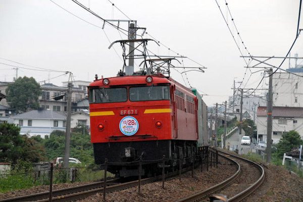 高性能機関車が開発された現在でも、上り貨物には全て「後押し」用機関車が必要な 難所です。EF67-0番台はEF60から3両が改造され、配備当時は補機の走行中解放を していた為、写真とは反対側にデッキがありますよ。EF59重連を単機での押し上げに 時期が来たようです。すでに置換用EF210-301が落成し、当面はEF67-0番台が置き 換えの対象。余命少ないEF67-1には、JRF広島車両所で昨年(2012年)秋行われた 「JR貨物フェスティバル」告知用にヘッドマークが掲げられました。JRを走るデッキ付 ELはEF67-0番台3両だけになってしまいました。デッキ側は回送時しか見られない、 山陽本線 瀬野〜八本松 2012-9 |