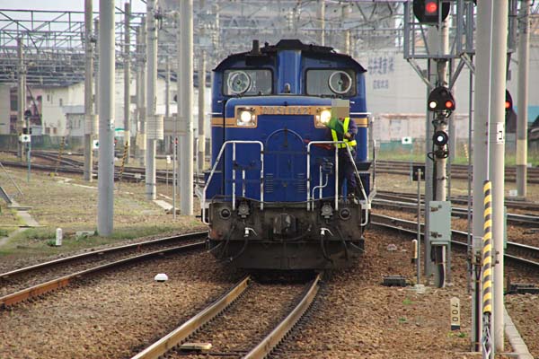 やがてブルーにゴールドラインのDD51重連が機待線から入換誘導でホームに進入。