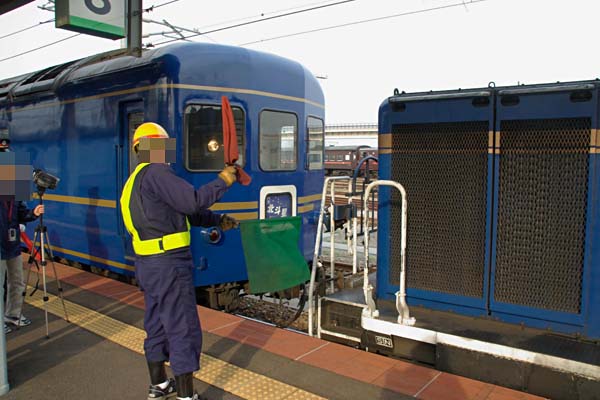 ホームでは函館停車のハイライト、客車列車ならではの機関車の付け替え作業です。