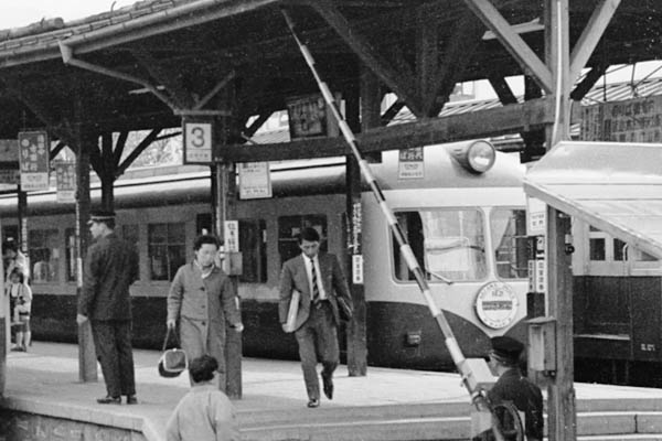 使い回しでございます。手持ちのフィルムをデジタル化保存の為、以前コンテンツ用に 小サイズでスキャンしたフィルムを再スキャンしたら、2000系の付けているは、ただの 先行板じゃなくって特急「のざわ」のヘッドマークだった事が判明したので、そのコマを 無理やりトリミングしてアップ致しました。2002年廃止直前の木島線は、線内折り返し 列車のみで、長野方面から直通列車のスジはございませんでした。しかし、コノ写真を 撮った1970年当時は、特急「のざわ」以外にも長野からの普通列車が多数設定されて いたのでございます。ちなみに1969年10月改正のダイヤを見ると、特急「のざわ」下り 61C列車は長野発12:35、信州中野着13:04、発13:06と読め、当駅で急行志賀1号 8038M上野行き国鉄から乗り入れ列車と交換となっておりますが、トリミングでカット した3番線には2000系特急湯田中行き、4番線は長野行き普通が停車しております。 まあ、写真とダイヤにゃ1年の時差があるんで、写っている特急「のざわ」がホントに 61C列車だったかわかりませんが、当時の木島線は、木島行きだけで28本のスジが、 設定されておりました。中小私鉄が、地方交通の主役だった、オジサン鉄青春時代の 活気溢れる長野電鉄の特急列車でございました。 河東(木島)線 信州中野 1970-10