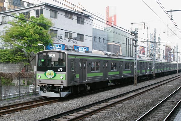 板物ヘッドマークを御覧ただきます。国電と言われた時代から首都圏の通勤路線を 走っていた銀箱電車と言えばこれもう205系しかございません。201系を除く鋼体車を 首都圏から追っ払った205系も、南武線がほぼ半減、短編成短線区や首都圏近郊の 線区で運用されている以外では、最後の牙城となった武蔵野線を残して、線路上から 消えてしまったようでございます。その205系初登場は、103系の置き換えを201系に しようか、モット安いのを新しく造ちゃおうか、散々迷った挙句に新型車でゴ〜となり、 山手線へ集中配置されてわずか3年3ヶ月で103系に印籠を渡したのでございました。 そして20年の時が流れた2005年4月、盛者必衰の習いの如く抵抗制御はインバータ VVVF E231にその座を明け渡し、餞に送られた「ありがとう205系」のヘッドマークを 付けて山手線外回り名残の走行でございました。 山手線 渋谷 2005-4