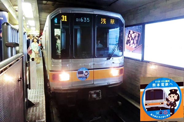 マッキイロ塗り、じゃなくて真っ黄色シール貼りの1000系に置き換えられてます。えっ もう置き換え、って思ったけど2000形なんぞの鋼体車と代わって登場してもう25年位 経つんですね。オラッチは、まだまだポイント通過時に車内灯が消える車両が脳裏に 残っているのに。でも嬉しいことに第二の職場が決まりました、熊本電鉄です〜よ〜。 早くも3月(2015年)第一編成が走り始めたので、もうご存知でしょうけど二編成目も 来年には走ります。今週のヘッドマーク探検団は、そんな転職記念HM「熊本電鉄へ」 を付けた銀座線01系135号編成です。トンネル人生のコイツが、来年には燦々と光り 輝く九州肥後の熊本電鉄でデビューするのが待ち遠しいオラッチなんです。 東京メトロ銀座線 銀座 2015-5