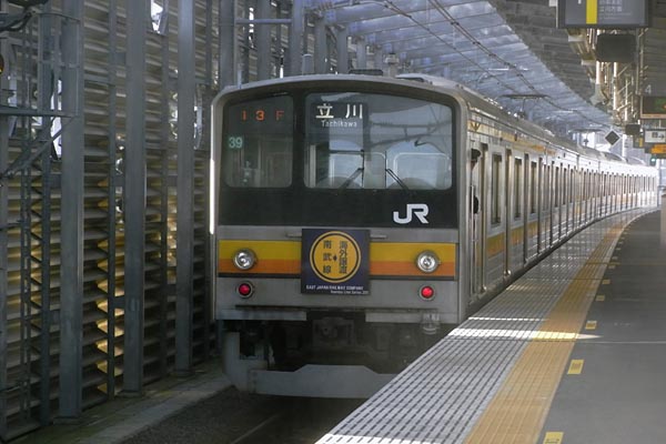 その新造車投入から1年余、横ナハE233-8000番台はN32まで増殖して209系と共に 南武線の主力だった、205系もいよいよ終焉間近となった様でございます。そんな時、 武蔵溝ノ口で乗った205系、もしかしてヘッドマークがっと思ったけれど、発車間際に 飛び乗った為に確認出来ずでございました。しかし、どの駅にも必ず同業者を見かけ、 HMの存在を確信して稲城長沼で降りて後ろに廻ると、案の定ヘッドマークが、それも 結構デッカイ板物のHMでございましたが、’ありがとう205系’系のノーマルなコピーと 考えていたら、「南武線→海外譲渡」なるコピーに意表を突かれたのでございました。 そこでググったら、引退した205系は、インドネシヤのジャカルタ首都圏鉄道会社にて 再度のお勤めとの事でございました。それから今回のHM、吊り掛け時代の南武線を 知っている思鉄にとっちゃ懐かしい、往年のサボを模したデザインが宜しいのです。 南武線 稲城長沼 2015-11