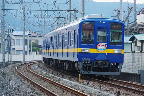 来ると思ったら、ブルーにイエローの帯という車体色の8000系が、東上線往年の特急 FLYING TOJO号のヘッドマークを模した「東上線全線開通90周年記念」のHMを付け 現れまし。しかし、、ホームの移動が間に合わず、入線を撮る事ができませんでした。 ところが、所用を済ませ戻った坂戸駅で再びブルーの8000系に遭遇いたしました。 こりゃもう走行シーンを撮るっきゃございません。そこで、ブルーの8000系に乗車して どこかで途中下車、越生からの折り返し列車の走行シーンをっと目論み、降りた駅は 武州長瀬でございました。いつもヘッドマークが無けりゃただの駅撮り写真みたいの バッカリなんで、たまにゃHM付けた列車の走行シーンも宜しいかと。しかし、現役の デハ10系は撮った思鉄ですが、ブルーにイエローの帯で特急フライング東上号として 活躍していたのは、見た事はございません。でも、東武最古参となった8000系にこの 車体色は違和感があるような。だって、国鉄時代のマヤ検みたいなんだもん。 東武越生線 東毛呂〜武州長瀬 2016-3