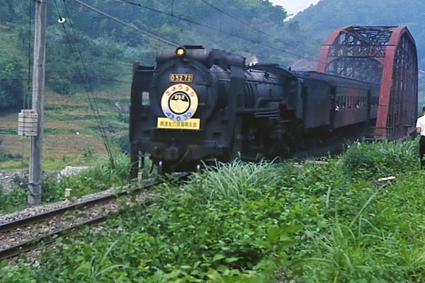 川越線に9600など、まだまだ蒸気機関車が走っておりました。そんな蒸気機関車が 走っている線区の中でも御殿場線のD52は特別の存在でございました。なんてたって 幹線用急客機で人気No1だったC62は、D52の缶にパシフィックの足回りをくっ付けて 造ったカマなのです。故に速いはC62ですが、パワーはミカドのD52がNo1なのです。 しかし、パワーの源ボイラーの太さは、当然軸重に影響してくる訳で、D52の軸重は 16t超となり、東海道・山陽本線や引退の線区となった函館本線などの幹線が、主な 活躍線区でございました。しかし、丹那トンネル開通で東海道本線からローカル線に なってしまった御殿場線は、線路規格は本線のまんまだった為、小田急線に乗って 気軽に大型蒸気機関車を撮りに行ける線区でしたが、近代化の時勢には逆らえず 1968年6月末日で非電化運転終了、その当日走ったD52 72号機が付けていたのは 手作りが嬉しい「さようならD52」の大きなヘッドマークでした。 千歳線 谷峨〜山北 1968-6