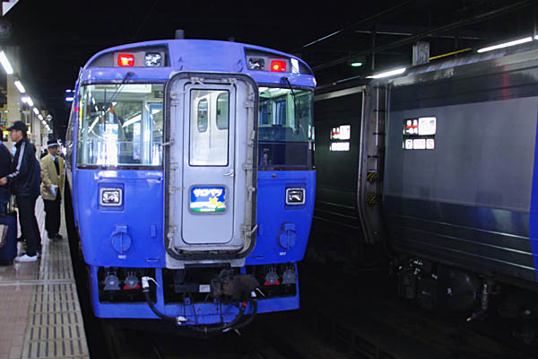 路線の廃止で揺れているJR北海道の特急「サロベツ」でございます。札幌発が12:30 稚内到着は18:22、上りは稚内13:44札幌到着19:14っというスジ、その他宗谷本線の 優等列車は特急「スーパー宗谷」午前、午後に1往復ずつ、合わせて3往復のスジが 現在設定されています。そこで思い出すのはご同輩!昔々C55や天北線の9600が、 煙上げてた頃にお世話になった3本の気動車急行じゃないすっか。運転時間帯こそ 1・2時間のずれはあるけれど、「宗谷」「礼文」そして、当時健在だった天北線経由の 「天北」って感じじゃないすっか。その内アッシなんかが当時良く乗車したのが、元祖 「サロベツ」の急行「天北」、毎晩布団に包まるなんてこたぁ当然出来ない赤貧の旅、 利尻のボックス席を宿屋代わりにして北上、C55や9600撮って「天北」で札幌へ戻り、 また利尻や大雪などで撮影地へ向かうが定番でございました。嗚呼懐かしき我青春、 せめて腹回りだけでもあの頃に戻りたいぃ〜 函館本線 札幌 2011-10