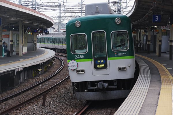 いたけど、近頃のHMはてぇっと、沿線のイヴェントのPRに名所旧跡・ランドマークが、 コウナッタ・ア〜ナッタ・ドウナッタで、付けちゃう様なのなんぞばっかりでございます。 今回ご紹介の「祝う国宝 岩清水八幡宮本社」もそんな流行のヘッドマークの一つで ございます。新調した貫通路の為か昔の面影が、有るのか無いのか、見様に因って 微妙に変わった2400系が、そのHMを付けて入って来たのは八幡市駅でございます。 その八幡市駅の南側に聳える男山標高147mの山頂に鎮座されているのが、本社が 国宝になってメデタメデタの岩清水八幡宮なのでございます。まぁコノ手のHMに最近 在りがちなヘッドシールなんかじゃなくって、キッチリ円盤ってぇのが、救いってえとこ なんでしょうかねぇ。そういやぁ、貫通扉に幕表示なんて野暮なモノが、無かった頃は ヘッドマークんところにゃサボが刺さっていましたねぇ、そんでもって、反対側のとこに HMを付けていたっけ、なぞとつい愚痴ちゃうのが、毎度変わらぬ偏屈ジ〜サン鉄の 悲しい性分なのです。 京阪本線 八幡市 2016-11