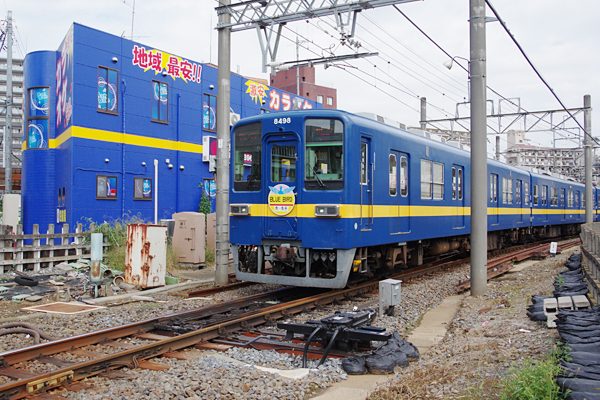 ヘッドマーク探検団2度目の登場相成りました、フライング東上号カラーの8000系では ございますが、得意の反則技でございません。前回8000系が付けてたヘッドマークは、 「FRYING ToJo号」の’寄居 池袋’の部分を’東上線全線開通90週記念’のコピーに 変えたモノなんです。今回のHMは、色使い似ているけど、「BLUE BIRD 青い鳥号」と いう全く別物のヘッドマークなのでございます。しかし、鉄世界に堕ちて半世紀となる、 フライング東上号既知の思鉄も此の「BLUE BIRD 青い鳥号」は初見でございました。 そこで、ググって見たとこ、フライング東上号用デハ10系編成を使った不定期特急の 愛称だったらしいのです。ブルーの車体に黄色の帯だから「BLUE BIRD 青い鳥号」 って、見たまんまにしちゃぁ、納得のネーミングだけど、沿線のイメージを考えちゃうと 「BLUE BIRD」って横文字が余計かも?ところで、線路脇に建ってるカラオケ屋さんの 外装、フライング東上号カラーとシンクロしちゃってんの気付きました。 東武越生線 坂戸 2017-9