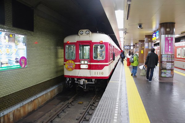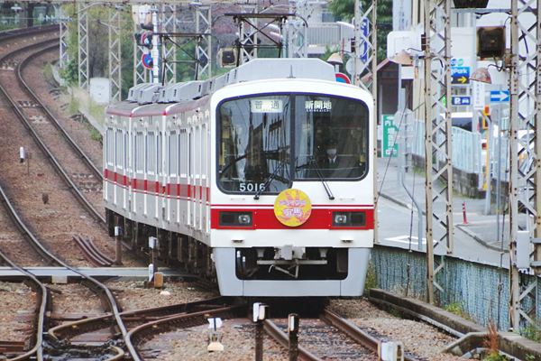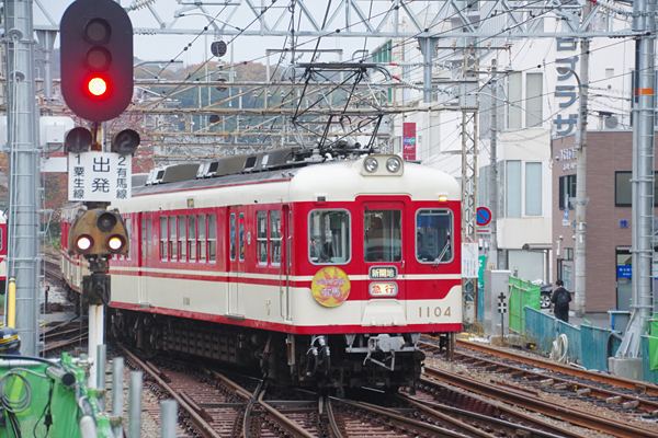 去年(2016年)の秋に思鉄団員共と関西廻った時のことでございました。例に因って 下調べもせずに神鉄三田線二郎付近での撮影を目論み、新開地のホームに入ると 目の前に如何にも初期高性能車然した、正面シンメトリー窓配置だけでも嬉しいのに 貫通扉まで備えた1100形が、紅葉に「ジョイフル有馬」と書いたヘッドマークを付けて 停車中でございました。そのヘッドマークも情け無いヘッドシールなんかじゃなくって キッチリ真ん丸の板物なのです。コリャ端からラッキーってんで、「ジョイフル有馬」に 新開地
