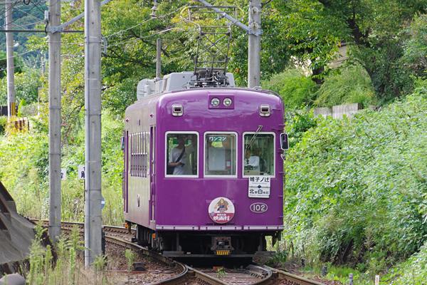 今回のヘッドマーク探検団は、シールでもペイントでもない真ん丸板物、もし触れりゃ 厚味を感じられちゃう、3次元のHMでございますが、「東映太秦映画村」のコピーに 銭形の親分が十八番の投げ銭ポーズの絵柄の広告ってのが、厳しい現実なのです。 それにしても、このアドHMは息が長い様で、10年前に嵐電で鉄した時にゃ、既に此の HMを付けた車両が北野線走ってましたぜ。その頃は今の撮影所前ってぇ駅は未だ 無かったよ。だけど、帷子ノ辻から僅か300mのとこにナンデ駅なんか造たんだろ? まぁ集客力のある「東映太秦映画村」の為になんだろけど。するてぇっと、アドHMは 嵐電のサービスで付けちゃってのかな?そんな事より、御年89歳モボ101形がHMを 付けてんのが、宜しいのでございます。形式記号も近頃流行ってるアルファベットや カタカナなんぞ付けたミョウチキリンなのたぁ大違いだ、明治・大正・昭和の御世から 中小私鉄の形式記号てぇなぁ、電動車の「モ」とボギー車の「ボ」でモボってな具合に 相場は決まってんだ、どうだぁ恐れ入ったか、って啖呵切ってどうすんの。 京福電気鉄道北野線 御室仁和寺 2017-10