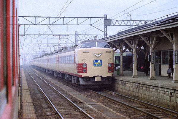 今回のヘッドマー探検団は、上野〜山形を東北本線・奥羽本線経由、難所板谷峠を 越えで結んでいた特急「やまばと」を名誉団長撮影銀塩総天然色でアップ致しました。 撮った駅はホームの駅名表から米沢、撮影ポジションは停車中の対向列車の窓から、 ってなキーワードから485系の特急は、下り「やまばと」ってぇとこまで判明致しました。 後は1〜3号の内どの「やまばと」か?この回答は撮影した対向列車が、米沢07:52発 併結気動車急行「もがみ」陸羽西線経由羽後本荘行「千秋1号」青森行4711Dなのが、 他のコマの新庄での分割併合シーンに写っていた、発車案内表示板で10;27発が確認 出来たから、この「やまばと」は上り1号1032Mでございました。しかし、撮影年月日が 分らないんで、取り合えずググるってぇっと、「やまばと」の9両編成化は、1982/11の 改正から、そして1985/3東北・上越新幹線大宮〜上野開業で廃止されちゃったんで、 撮影は1982年〜1985年の間ってぇとこまで判明致しました。なんだか、今回の主役は 「やまばと」のHMよっか、ヘッドマーク付けて無い併結DC急行「もがみ」「千秋」の方に なっちゃった様でございました。 奥羽本線 米沢 1982〜1985-? |