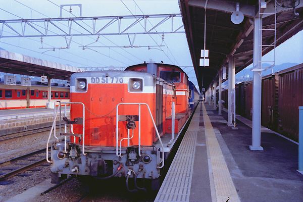 って、一通り愚痴った後で、牽引機のご紹介でございます。紀勢本線と言えばカマは DF50でございますが、特急の「紀伊」は、赤字国鉄精一杯のサービスか当時の「亀」 最新鋭DD51の仕業でした。 紀勢本線 新宮 1981-8 |