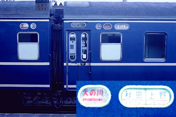 前回のマトモなヘッドマークとは真逆、以前にアップした「八甲田」と同じまやかし物の デッキマークは、名誉団長撮影20系夜行寝台急行「天の川」のでございます。アッシャ このネガスキャンするまで「天の川」てぇなぁ、’荒海や佐渡に横たふ天河’って、俳聖 芭蕉翁の詠んだ如く新潟行だとばっか思ってったら、秋田行きん時もあったんですね。 新潟行「天の川」秋田行「鳥海」ってなアタマしか無かったんで、調べてたら1972年に 運転区間を秋田まで延長してたんですねぇ。ちなみに1974年1月号の時刻表を捲って 見るてぇっと、「天の川」は新潟白新線経由だけど、「鳥海」の方は新潟にゃ寄らないで 新津から直接羽越本線経由秋田でございました。そして、上野発時刻も「天の川」は、 22:38とギリギリ新潟早朝着可能なスジ、一方「鳥海」の秋田着時刻は8:16と、朝から 働く出張オト〜サンがこき使われるスジでした。だけど、羽越本線走って「天の川」は ないよなぁ〜、せめて出羽三山の内気動車急行で使用済みの「月山」以外、「羽黒」か