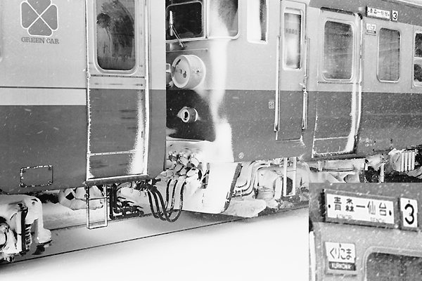 猛暑日なんてぇトンデモナイ温度が応える、今日この頃でございます。そこで、見た目 だけでも涼しくってんで、反則ではございますが、雪まみれとなったの急行「くりこま」の デッキマークで暑中見舞い申し上げます。「くりこま」と言やぁ、評定速度80km/h超え 特急もマツァオの快速を誇った、韋駄天急行でしたねぇ。なんてたって、急行が急行を 途中で追い抜いちゃうですから。アップしたのは、青森13:05発仙台行「くりこま」1号 1512Mだと思うけど、もしかしたら青森16:30発の「くりこま」2号の方かも知れません。 その「くりこま」2号が、途中で先行の急行列車を追い抜いちゃったでんす。ちなみに、 手元にある1974年1月号の時刻表を見るてぇっと、「くりこま」2号の一ノ関発が20:10、 秋田〜仙台間の急行「たざわ」2号4814Dの一ノ関が19:53でございました。ところが、 仙台到着時間「くりこま」2号21:17、「たざわ」2号21:36と逆転、時刻表を読み取ると、 瀬峰で追い抜かれた様でございました。ホントは、特急種別で運転したかったのに 455系列の運用で急行種別にしたのは、何故なんだろう?単純に485系列の車両が、 足らなかったからかな? 東北本線 野辺地 1973-1 |