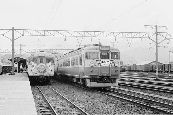 一般乗客の迷惑の中、JR西日本の思惑か、北陸新幹線の敦賀延伸アリバイ開業を 散々愚痴ったけどまだ愚痴り足りません。なので、今回も国鉄北陸本線の優等列車、 大阪〜金沢を結んだ急行「ゆのくに」を松原物故団員撮影のモノクロからアップです。 写ってんのは、恐らく大阪9:25発「ゆのくに」1号1501M455・457系12連、米原経由で 福井到着が12:28所要2時間52分でございます。流石に米原経由なんで、今の敦賀で 新幹線乗換に比べて1時間位余計に掛かちゃいますが、急行券はかなり格安でした。 撮影した1974年当時200kmまでの急行券200円+指定券100円=300円、特急券は 指定料込みで600円でした。現在の特急料金は1974年の約4.5倍なんで、もし急行が 今も走っていたら、300x4.5=1350円と乗車券で福井まで乗り換え無しで行けちゃう。 はずです。国鉄時代は急行に特急、在来線新幹線乗り継ぎと自分の懐具合に合せ 乗車する列車を選べたけど、今は新幹線が延伸する度に在来線が、ヘンテコリンな 名前の三セクに強制変換、一体何の為に国鉄無くしちゃったの?あと、「ゆのくに」の 左っ側に停まってるヘッドマーク付けたキハ58は、湖西線開通の記念列車です。 国鉄 北陸本線 敦賀1974-7