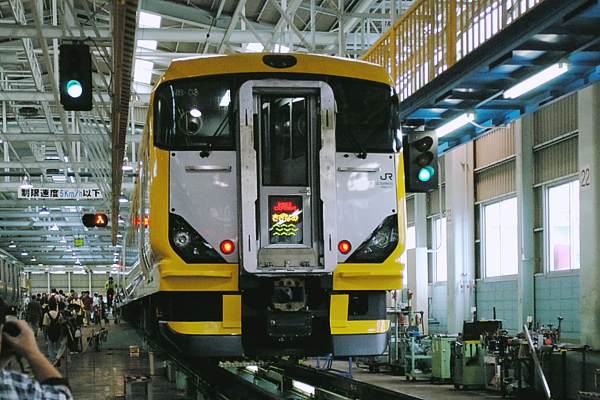 今回のアップも大井工場オープンデイでスナップした、ヘッドーマークでございますが、 前回、前々回のイカサマと違う本物の特急E257系500番台「さざなみ」でございます。 E257系自体は、0番台が2001年より中央東線で運用されてたけど、コチラ500番台の 方は、出来立てホヤホヤ営業運転も2004/10/16のダイヤ改正後、オープンデイの 目玉車両の一つでございました。しかし、時は既に遅し、183系総武本線経由だった 時代の1975年当時は、2本の臨時を含め9往復のスジが、ほぼ館山まで在った特急 「さざなみ」も1997年の東京湾アクアライン開通によって、徐々に運転本数を減らし、 運転区間も君津までに短縮され、朝夕のみ運転の通勤ライナーになっちまいました。 JR東日本 東京総合車両センター(大井工場) 2004-8