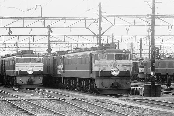 20系の「南」シナ、151系の「南」チタ、EF65P型の東京機関区、品川から田町の間に 車窓に映った国鉄現業部門は、半世紀以上昔っから鉄に嵌っちまった、アッシなんか にとっちゃ。一度は訪れたい聖地でございました。その聖地のひとつ、東京機関区を 松原物故団員が、クラブ活動の一環として許可得て訪れた時に撮影した、寝台特急 「あさかぜ」のヘッドマークを付けた、EF65 531号機と535号機をアップでございます。 でも、撮影当時「あさかぜ」は、東京〜博多間に2往復のスジが引かれていたけれど、 学生が施設見学する様な真昼間の入出庫は、考えられないんで恐らく機関区の方が、 気を利かせて付けてくれたんだろうと思います。しかし、品川〜田町間に新設された 高輪ゲートウエイってな、とんでもないネーミングの駅って、一体なんなの?日本語を おちょくってるとしか思えない様な駅の為、名門東京機関区が、無くなっちゃうなんて。 東海道本線 東京機関区 1969-10