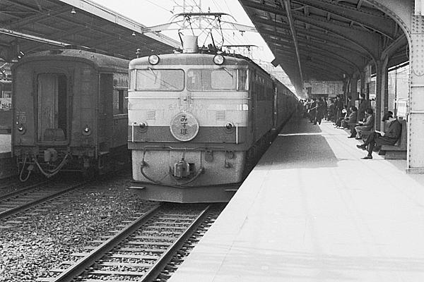 今時特急「みずほ」と言えば、新大阪〜鹿児島中央間を最速で結ぶ、アッシなんざぁ 旅情の一欠けらも感じられ無い、高速ベルトコンベアーチックな山陽・九州新幹線の 「みずほ」ございます。でも、国鉄時代から鉄に嵌ちまった、ジ〜サン・オジサン鉄の 特急「みずほ」は、東京〜熊本間を結んでいた、寝台特別急行列車ブルートレインの 方なんですよ。ってな訳で、今回のヘッドマーク探検団は、松原物故団員が横浜駅で 撮影した、愛称の由来’豊葦原瑞穂の国’に相応しい、EF65 507号機が20系14両を 従え入線して来た、東京行き4レ特急「みずほ」をアップです。ところで、「みずほ」の 左っ側下り本線に最後部だけみえる旧客編成列車が、特定できないんです。当時の スジは上り「みずほ」横浜着10:11発10:12なんだけど、同時間帯で発着する旧客編成 下り列車のスジが、1967/8号の時刻表にゃ無いんです。在るのは、電車列車331M 豊橋行きなんです。もしかして、撮影日と時刻表に5ヶ月の時差が、あるからその間に 旧客から電車に置き換えたのかな? 東海道本線 横浜 1967-3