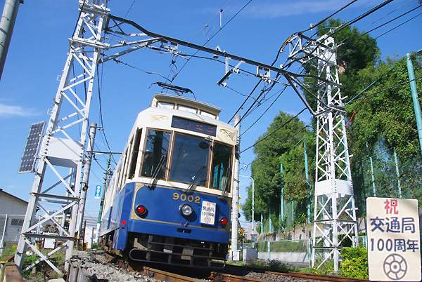 鉄分多めな方々御用達’ヨドバシカ〇ラ’社名の元となった、淀橋浄水場跡に建ってる 都庁の主となったオネイ様が、音頭を取って命名したらしい’東京さくらトラム’。ってな JR東のE電と一二を争う、死語必至な愛称を付けられちゃったのが、東京都交通局 荒川線です。その荒川線を走るレトロ風車体の9000形が、付けているヘッドマークの 「祝交通局100周年」をアップです。でも、このスナップの本当狙いは、左右に建ってる ラーメン架線柱、HMじゃないんです。この架線柱は、荒川線以前の27系統32系統を 開通させた、王子電気軌道が、1911年最初に大塚〜飛鳥山上を開通開業した時に 建てられた、王電の面影を今に残す貴重品なんです。 都電 荒川線 巣鴨新田 2011-10