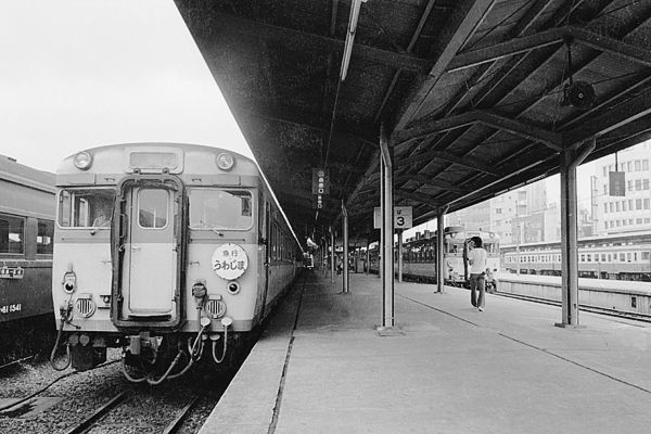 位置は変わったけど、瀬戸大橋線で繋がる今も、連絡船時代の昔も変わらないのが、 旅情を感じる高松駅の頭端ホームでございます。その連絡船時代の高松駅4番線に 停車中のキハ58系気動車は、宇野発9:17高松着10:27の宇高連絡船11便を受けて 宇和島間へ向う、高松発10:38宇和島着16:11予讃本線の急行「うわじま」5号609Dで ございます。当時の国鉄四国総局は、気動車王国と呼ばれ、当に58系気動車急行の パラダイス、特急のスジは、「しおかぜ」3往復「南風」1往復しか無く、急行自由席しか 乗れない均一周遊券で鉄旅するビンボ〜鉄とっちゃぁ、実に移動しやすい処でした。 昼間は、四国周遊券使って撮り鉄・乗り鉄三昧、夜になったら、80km以上何処まで 乗っても300円の普通列車グリーン券を使って、急行「あしずり」7号折り返し運用の 高松発0:19中村行733Dのキロ28で一泊、本当に国鉄時代は、コスパ最高でした。 国鉄 予讃本線 高松 1974-8 Photo by 松原の親方 |