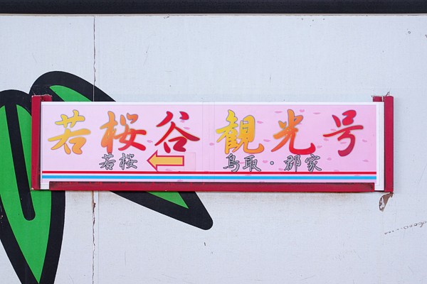 紛い物にゃ違いないけど、今回ご覧頂く愛称名は,WT3000形の側面に挿しってあった 「若桜谷観光号」なるサイドマークです。アッシャこの「若桜谷観光号」に乗って若桜に 行ったんですけど、車内にゃ観光案内の為にボランデア方々が、添乗していました。 今回このサイドマークをアップする為、色々ググッてみたけど、観光列車「昭和号」の 情報は、沢山見っかったけど、「若桜谷観光号」の方は、ほぼノーヒットの為に駄文を 綴んの一苦労でした。ヤッパこの手の観光列車は、貫通路にデッカイ真ん円板物を 付けんのが、一番宜しい様でございます。 山陰本線 鳥取 2015-9 Photo by 団長 |