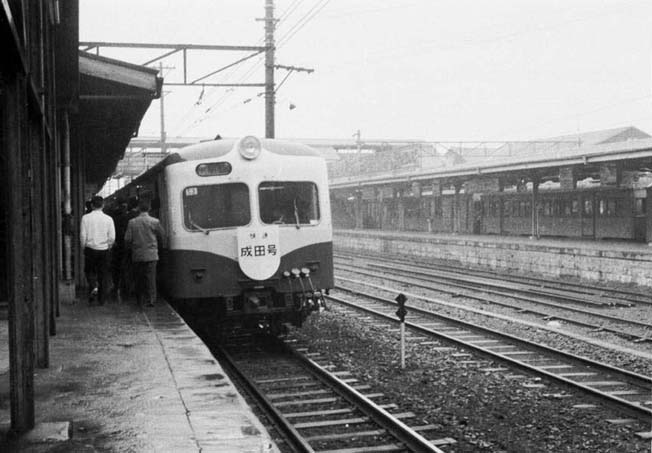 しかし、電化開業は3月28日撮影は4月29日、一体何時頃まで完成記念で、快速「成田号」を 走らせたのかは判りません。電化当時の総武・成田線は千ツヌの101系と73系で運用され、 千葉鉄管内に70系の配属は無かった筈、1968年と言えば、横須賀線の70系が113系に 置き換え完了の年、恐らくは他区へ転出予定で余剰気味の南フナ70系を快速「成田号」運用に 充当したのではと、適当に推理しました。東海道では些かお疲れ気味の70系も千葉鉄で走れば 人気爆発の様で、写真を見ると、乗客が我先に乗ろうとしている様に見えますね。 また、地平時代の船橋駅には何となく郷愁を感じてしまいます。バックに見える野田線ホームに 停車中の3210系?コレがまたナツカシィ〜〜〜イ! 総武本線 船橋 1968-4 |