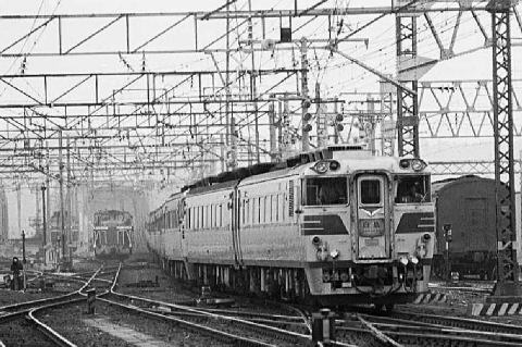 ボンネットがないから変ですって!ちょいとそこの若い鉄っあん、何年生まれなの? え〜1972年生まれ!、それじゃアタシが退職した年だわ、んならしょうがないネ。 というわけで今回は初代「白鳥」のキハ82にお出で頂きました。所で愛称の由来、 知ってますか?特急の愛称と言えば、昔から花鳥風月を表す、美しい言の葉と 決まっていました。ですから当然「白鳥」の愛称も日本海を優雅に走るその姿から 名付けられ、かつては○日本のクイーンとまで呼ばれていたのです。 1961年10月ダイヤ改正で登場、当初は大阪から上野行と青森行の併結列車でした。 その後上野行は”はくたか”として独立した列車となり、「白鳥」は大阪〜青森間の 長距離ランナーとして定着しました。1972年10月の羽越本線電化で485系に 置き換えられ、昨年惜しまれつつも引退したのはご承知の通りでしょう。グリーン車や 食堂車も連結されていた列車でも、全線通しで乗ったのはやっぱり「鉄」な人ばかり? (文中の○は一様差別用語なので)