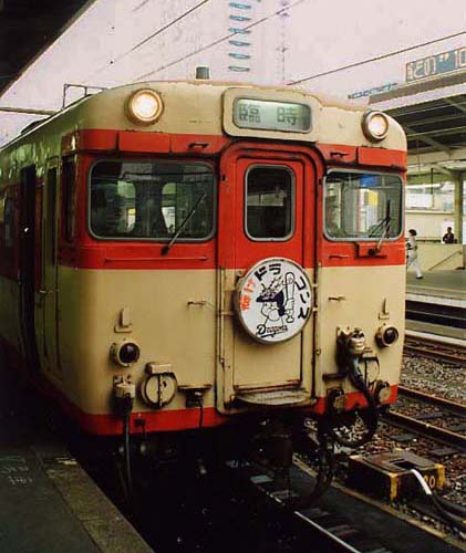 ♪燃〜えよ〜ドラゴンズ〜♪ のテーマソングに乗せて登場した貴重な写真は、 臨時列車「輝けドラゴンズ」号!! 登場したのは1987年7月、国鉄民営化による 積極的施策により、当時のナゴヤ球場の傍らを通っていた名古屋港線(貨物線)に、 臨時駅ナゴヤ球場正門前」を設けて、観客を輸送した列車でした。また、キハ82も 間合運用で「輝けドラゴンズ」号のスジに載ったとか。キハ82に乗って応援に行けば 一層力が入ったでしょうね。その後東海道本線の尾頭橋駅の開業にともない、 1994年のシーズン終了をもって、 運転終了となりました。 所でドラゴンズといえば何と言っても”熱血漢 男仙一”打倒巨人一筋の燃える男、 ドラゴンズでは巨人を倒す事だけ考えて闘志を燃やした仙さんも、今は巨人の前に ”打倒フロント”だそうです。アァ〜ア! (当初は”頑張れドラゴンズ”の愛称で運転開始、年度に拠って絵、文字が変化しました。)