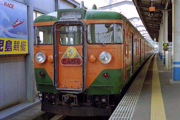 正調「金毘羅船々」でも口ずさみながら、長閑な瀬戸内の日差しを浴びて、ノォンビリ 四国詣なんてオツなもんでやんすなー えっ、ナニナニ、「今のご時世時、 瀬戸大橋で 轟音響かせ10分もあれば四国に着いちゃう。おまけに橋脚、桁鋼で瀬戸内の眺めが よろしくない。」 だって?そうおっしゃる、○金マークのゴージャスHM「こんぴら」号さん アナタ様はいったい・・・お見かけしたところ、とても優等列車にゃ見えないですねぇ〜 あぁ〜もしかして快速・・・んでもないって? えっ、ただの普通電車だって?なんでまた 普通電車がそんなりっぱなヘッドマークを付けてるの? フムフム、アナタ様は琴平へ 入りれるJR西日本の電車で、四国乗り入れをアピールするためだって?あたしゃまた 自転車屋の宣伝かと思ちゃいましたよ ♪○金自転車ホイノホイノホイ♪ ってね。