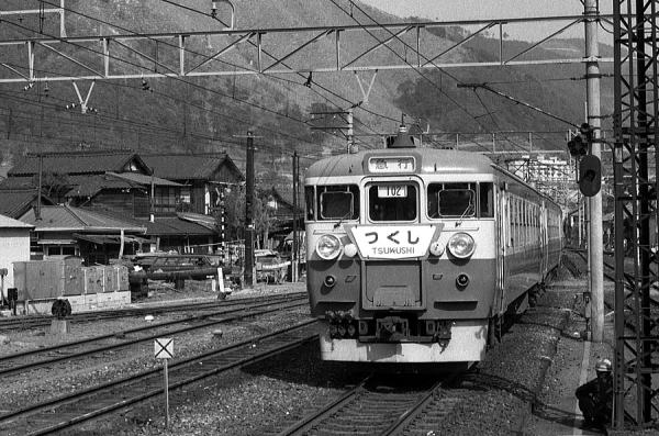 ”ちくし”って。案内されてるんだけど、これ「つくし」とも読んだ気がするんだよなぁー てンで、調べてみるってーと、これが天孫降臨までさかのぼって・・・ ナニ?そんな 講釈聞きたかーない。そんなもんより457系を解説しろって? そりゃーそうでしょ、 仰る通り。 ところがコイツにあんまり自信がないのヨ。なにせうろ覚えなもんで、 間違ってたらゴメンナサイねーと、逃げを打っといてっと・・・ 1965年に本州−九州 直通電車急行の歴史が華々しくスタート。この頃は急行だって幹線の花形。 サロ2両、サハシ2両を従えての堂々12両編成ときたもんだ。「つくし」もこのとき 大阪−博多の電車急行としてデビュー。ヨンサントーも岡山開業も乗り越えたけど、 さすがに新幹線博多開業には太刀打ちできずに消えていった・・・というところで、 何度かお世話になった、三原駅軸足不動HMシリーズもこれでとうとう出「つくし」た、
