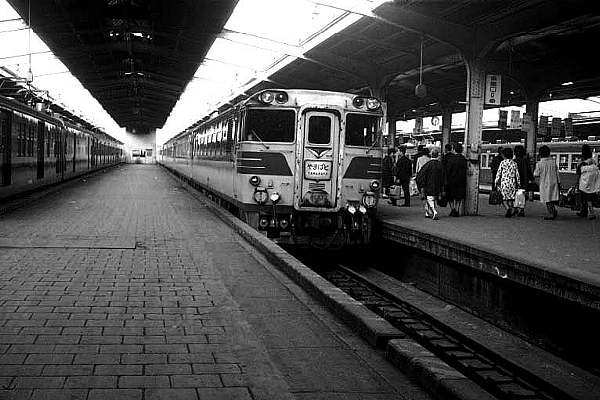 特急「やまばと」ちゃんドェ〜ス。えっお前なんか知らないヨッテ?いやぁ〜判らないのも 無理はありません。何ツ〜テモ前回登場した時は485系の衣装で板谷峠の晴れ舞台、 今回は1968年の山形交流電化以前、1964年に初めて走った時からの伝統の姿、 キハ82系の衣装を纏っての登場ですから。舞台は板谷峠と甲乙付け難い、懐かしさが 溢れる上野駅地平だぁ。「やまばと」ちゃんに乗るためにホームを歩いていいる人達の 後ろ姿が何故かウキウキ気分に見えるのは、ヤハリ当時の特急の醸し出す格の高さ。 ぶら下がった案内板、和装の御婦人、赤ちゃんオンブのお母さん、その総てがキハ82 「やまばと」にお似合い舞台装置だ。 (コチラにも1967年の上野駅風景をUPしてます)