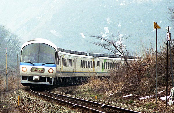 今回で3回目の使い回しだもんなぁ。という事で、14系、キハ181系の「シュプール号」に 続く3回目登場の「シュプール号」は改造気動車「シュプール白馬・栂池」号なのです。 キハ65系の改造車で、元々は福知山線の電車特急「北近畿」(183系電車)に併結して、 宮福鉄道(現・北近畿タンゴ鉄道)宮福線に乗入れる臨時特急「エーデル丹後」として 今じゃ、こうした列車自体がなりたたないとは、なんとも寂しいものです。 大糸線 北小谷〜平沼 1992- |