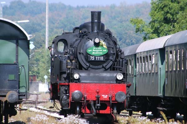 って踏ん反り返ったてアップしちゃいましたヨ。エッ’横に写っている客車もプレートの 形式番号もよく見ると何か変じゃねぇの?’ トンデモナイそんな事は あり・・・・ます。 やっぱりバレバレのHMは、日本海を渡りアムール川に沿いバイカル湖を横に見て ウラルを越えた欧州ドイッチュランドのAmstetten と言う所で撮ったもでございます。 HMには「100 Yahre 1906 Amstetten 〜 Gerstetten 2006」と書いてありますけど、 なにせ相手はオジサン鉄大の苦手の横文字ですよ、わかんねぇ〜よコンナHM。まぁ これで済めばいいんですけど、アップした手前そうもいきませんね。そこで無い頭で 想像致しました。この機関車はBDの駅がある Amstetten から終点Gerstettenまで とうの昔に客貨の営業を中止した路線上を年に何回か運行されているます。イワユル 保存鉄道みたいなものですね。そして、Amstetten 〜 Gerstettenが開通してから この写真を撮った2006年で100年目って事で付けられた記念のHM じゃないっすか。 早い話が「開通100年記念」号ですね。でもホントかな? Deutsche