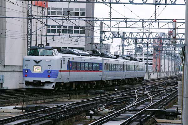 していた「ライラック」でございます。今ではメタボ腹を揺すりながら鉄をている思鉄が、 すきっ腹を抱えて追い駆けていた煙が道内から消えると、入れ替わりに登場したのが 寒さに負けない781系でした。煙が消えると思鉄も道内から消えた為、781系と思鉄は すれ違人生。地平時代の札幌駅に発着する国鉄色で6連の781系を一度でイイから 見たかったなぁ〜。しかし、80年代半ばに運用本数を増やす時に、車輌増備ではなく 編成の組み換えで対処した為、それから運用廃止の2007年までは編成数両が僅かに 4両という特急と呼ぶには情け無い姿、パスモでピッの井の頭線だって20m5連ですゼ。 しかも、特急用車輌の証各車輌車端に1ドアの乗降ドアも増設して2ドアにしちまうし、 トドメは札幌から千歳空港までは快速”エアポート”となり特急券は不要だって、今まで 特急料金払って乗っていた席が札幌で向き変えて出発した途端ロハぁ〜!こうなると 思鉄の思考能力では特急と快速の区別なんてホント、解んなくなっちまいますよ。 函館本線 札幌 2005-8 |