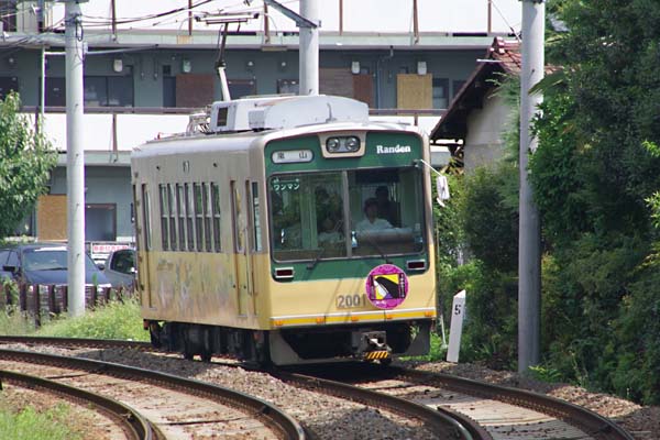 嵐電唯一のVVVFインバーター制御のカルダン駆動車モボ2000形。その最新技術を 駆使した2000形に付いているヘッドマーク、描かれているのは長い黒髪濡れ羽色、 目は切れ長で色白く、典型的な平安時代のオネ〜サンでございます。流石千年の都 平安京を走るに相応しい風雅なヘッドマークでしょ。このヘッドマークが「源氏物語」の 存在が確認されてから千年目を記念して付けた「紫のゆかりちゃん号」でございます。 でも、なんで「紫のゆかりちゃん号」なんでしょうかね?「源氏物語」の記念なら当然 「紫式部」じゃなきゃ変ですよね?歴史上余りにも有名すぎてHMの名前に使うのが 恐れ多いからなんでしょうかね?で、無い知恵絞ってもしょうがないから、ググルと 「源氏物語千年紀委員会」ていうのがあって、「源氏物語」のいにしえから別称という ことで、この企画のキャッチコピー「紫のゆかり、ふたたび」に因んだことが判明。 一時は卓袱台に一瓶、○屋○○むらさきの新製品キャンペーン用と思ちゃいました。 京福電鉄嵐山本線(嵐電) 帷子ノ辻 2008-8 |