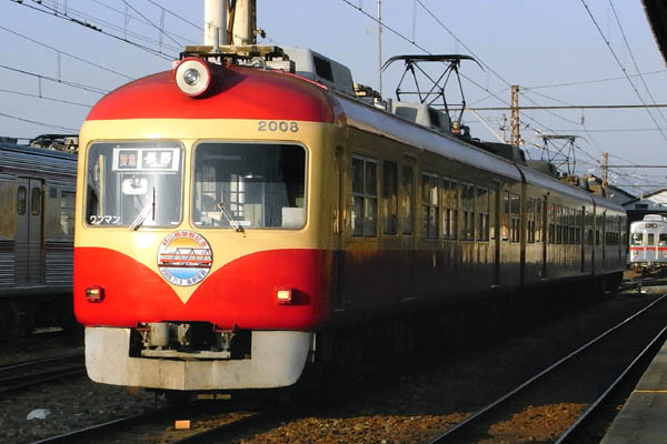 通常は鹿のデザインにアルファベットで「SHIGA KOGEN」のヘッドマークなんですが、 この2000系D編成りんご色に付いているのは「村山橋架替記念」なんでございます。 長電と言えば湯田中に滋賀高原と山のイメージが強いんでなんですけど、川を渡る 橋梁にお宝があるんですよ。鉄にはお馴染み有名ポイント夜間瀬の鉄橋、現在は 小布施に展示されている明治時代に英国で製造された旧松川橋梁、そして今回の HMに登場でもう直ぐ新しい橋に架け替えられる、1926年に川崎造船所で造られた 鉄道道路併用橋の村山橋といった具合ですね。ところで思鉄一同にはコノ2000系に 昔々学割2000円チョイで買えた、均一周遊券の中で一番安い信州周遊券で信州を 巡っ時に会った、2000系全盛時と同じ色使いを見て、懐かしぃ〜と感激でした。 しかし、一通り感激してよく見ると、運転席の窓内側に方向幕プラス種別幕トドメに 「ワンマン」のマーク!一気に悲しい現実に引き戻されてしまいました。だって昔は 特急列車っていやぁ2000系に決まってるし、行き先だってワザワザ断んなくたって 長野〜湯田中ダゼ。 長野電鉄河東線 須坂 2009-10 |
