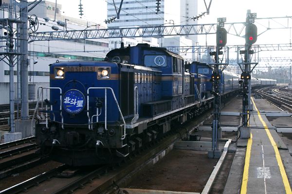 在庫切れ状態、そんな訳で今回は2回目出演となった寝台特急「北斗星」の登場です。 ただ、前に登場した時のカマはEF81で、今回は鷲別のDD51青ガマ重連牽引なんで、 そこんとこヨロシク。しかし、カッコいいですね、これぞヘッドーマークって感じの円盤を 付けた全長18mのディーゼル機関車が2両連なっての急客仕業、本当に絵に描いた 様な特急列車っていう感じじゃぁございませんか。それに、世界の鉄道を見回しても センターキャブの幹線旅客用ディーゼル機関車なんてJRのDD51以外殆ど見ることが 出来ない、中々のレアものでございます。そう、機関車が客車を引っ張って走る姿こそ 鉄道の原風景だとオジサン鉄集団の思鉄は思っておりますぞ。DD51も車令40年余、 ナクナル君が暗躍する前にシッカリと網膜に焼付けておかねば。 函館本線 札幌 2005-8 |