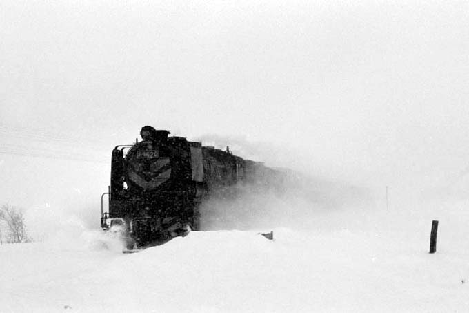 何処が線路かまるでわからない、視界殆ど0%の豪雪なか、峠を下ってきた、トラ塗りキューロクの