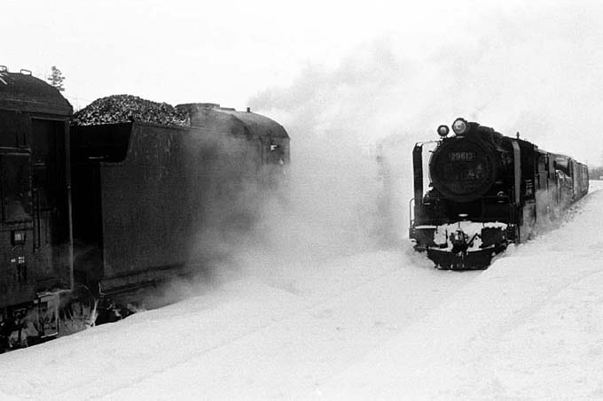 寒さで蒸汽が車体を包まれたC55の牽引324レと交換の為、構内に進入する、29613号機