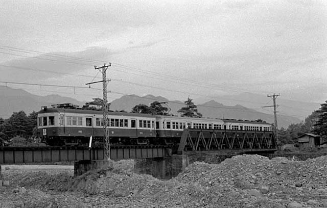 今は現役を退き小布施に展示されている松川橋梁を走る1000系。