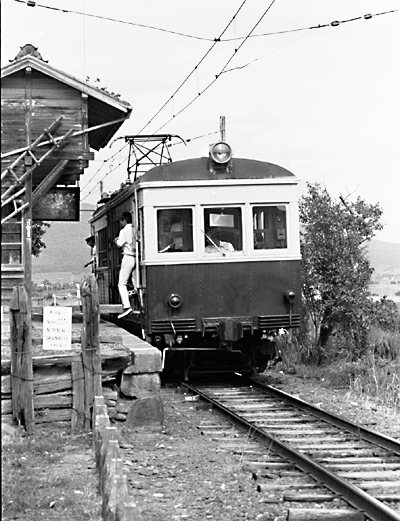 八木沢駅に停車中のモハ5250、駅名板も好ましい。