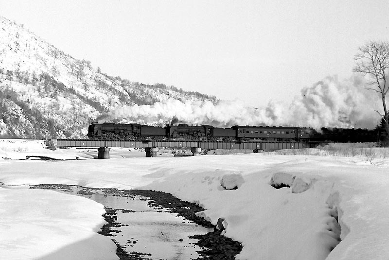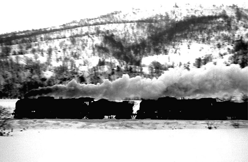 1969,3 長万部 こちらは正当な??C62重連103列車「ニセコ」、冬の夕陽を受けて旅立ちます。