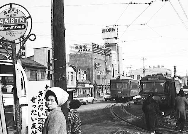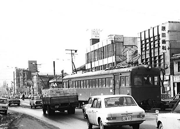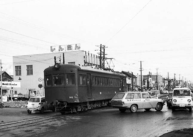 | 国鉄旭川駅からバスで10分ほどのところ、四条18丁目バス停をおりると、旭川電気軌道の旭川四条駅が ありました。ここを起点に東山にいたる線と途中旭川追分から分岐して旭山公園に至る線があり、ともに ほぼ1時間間隔で運転されておりました。私が訪れたのは昭和46年3月23日。実はこのとき体調を崩して、 札幌の宿(札幌のYH,札幌ハウス=今もあるのでしょうか)で寝ていたのですが、午前11時頃になりなんとなく 体調が良くなってきたので、ここを訪れたわけです。したがってホントに僅かの訪問に過ぎず、しかもやはり 体は復調せず、結局、旭川四条と旭山公園の間を往復し、四条の駅とその近辺の併用区間の撮影のみ。 その後比較的早く廃止となり2度目の訪問はなりませんでしたが、この時に訪問していたことが良かったの かどうか。なにしろ無理がたたって高熱を発し、翌々日には北海道を去らねばならなかったのです。若い日 の苦い思い出です。 |
