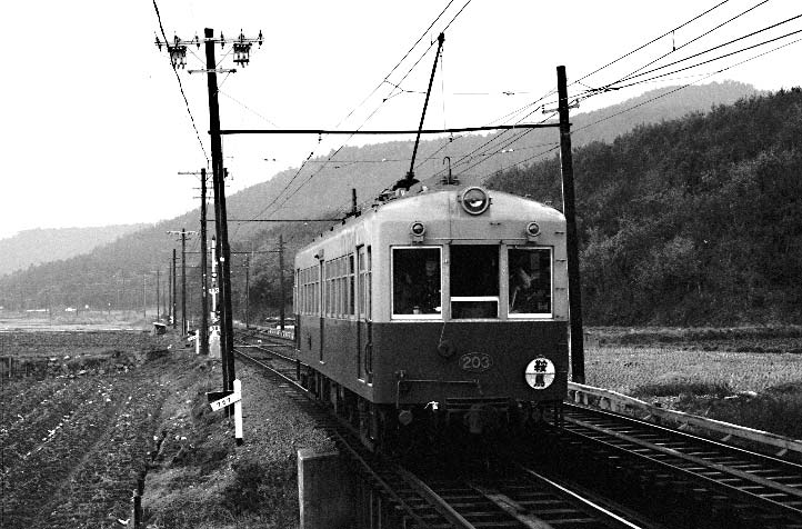 して、 京都の北東部を走るこの路線は、殊のほか寒かった記憶があります。九州からの帰路、夜行急行では一日で 帰り着かないため、大阪まで急行で来てここで 一日過ごし、大垣発の夜行344Mを乗り継ぐ行呈でした。 大阪からは淀屋橋を経由して京阪電鉄の特急。三条から市電に出町柳へと向かったのですが、問題は 京福線内でどう動いたか・・・まるで記憶がありません。出町柳で写真を撮ってその後鞍馬へ向かったはずなのに、 どこか途中で降りてしまったようです。なに せ鞍馬の駅の写真はないし、あるはす゛の切符も出てこない。 下車して走行シーンをどこで撮ったのか??? 構内配線などから見ると二軒茶屋かと思うのですが・・・なんとも 情けなくUPもどうしようか考えたのですが、皆様に撮影地を教えてもらえればと思い、UP してしまいました。 叡山線は1978年までポール集電をしていたが、これは国内で最後まで残ったポール電車でした。 |
