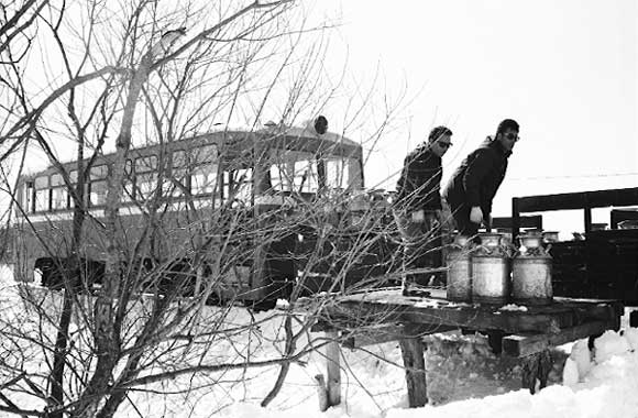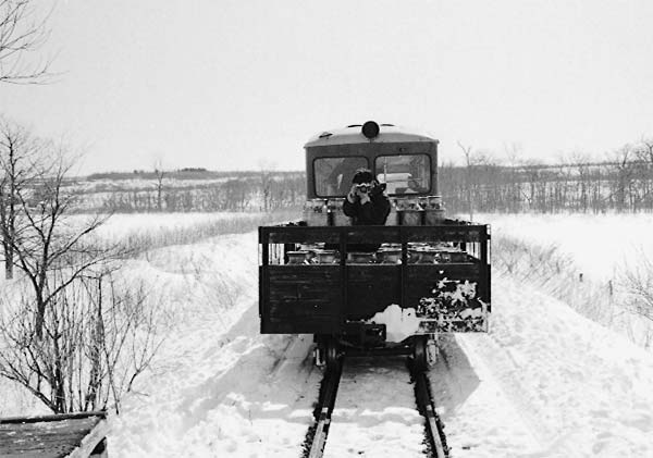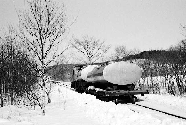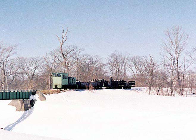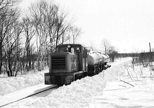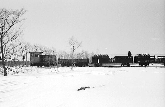 ちょうど通学列車だったため、 途中から高校生が乗り込んできて、車内はほぼ満員でした。しかし沿線は冬のせいもあり、ただ雪の 原野がひろがるだけで、本当にぽつんぽつんと家が見える程度、雪がなければおそらく牧草地帯なので しょうが。ホームもリンゴ箱みたいな簡単な木の台があるだけでした。途中の分岐も、 何も無いところで 線路がわかれているだけでした。終点の西円朱別には手動のターンテーブルがありました。帰りは一緒に 訪問したカモ団員と私の二人だけが乗客・・・運転士さんと色々話しながら茶内に戻りましたが、 「東京から写真を撮りにきた」というと、「じゃあ、途中で止めてあげるから降りて撮りなさ い」・・・・ 結局三箇所ぐらいとめてくれ、バックして走行シーンを撮らせてくれました。 |