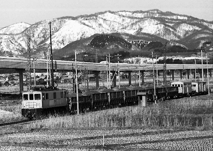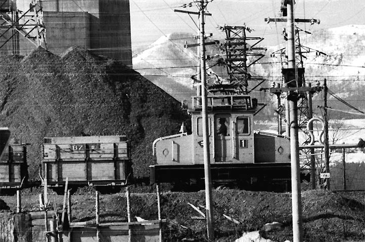 石灰石を積んで、鉱山から戻った列車牽引は東洋電機40tEL、うしろには人車も連結されています。