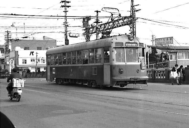 1968,3 京阪七条付近を行く京都市電が、鴨川の橋から京阪を交差するシーンです。