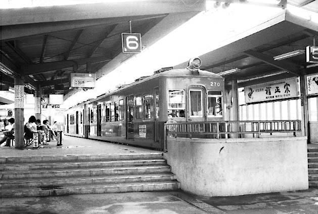 | 京阪電鉄、このページでは京阪三条を中心に送りたいと思います。三条は、京阪本線の終点、 そして京津線の起点でしたが、その構内配線・そして雰囲気は特徴的でした。残念ながら駅の 全景を撮っていませんが、その一部でもご覧いただきたいと思います。 |