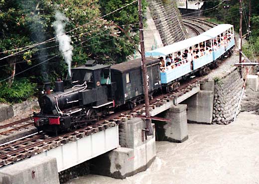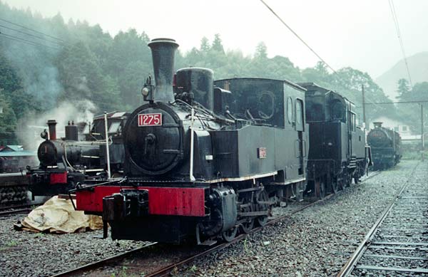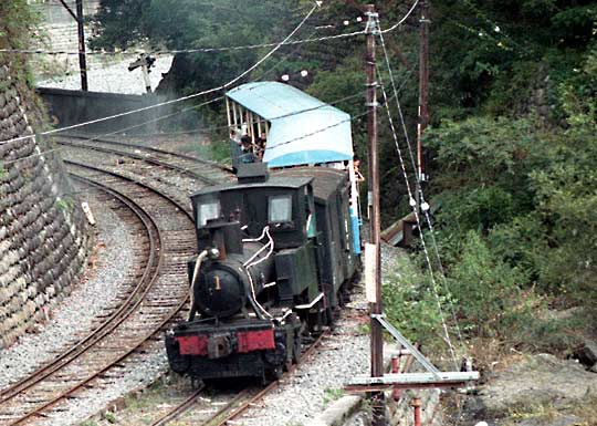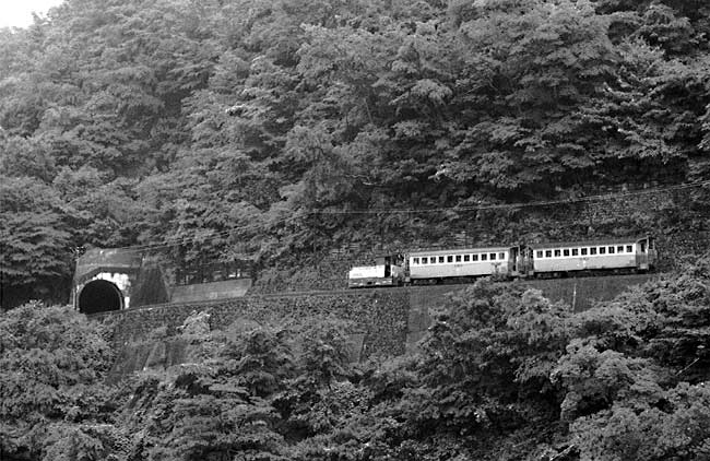 井川駅にて 狭い崖の中腹にある駅、長編成だと後部はトンネルの中でした。 1983年訪問の中からC形コッペルの保存運転とSSE